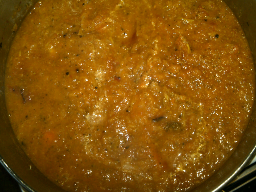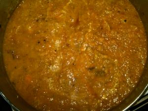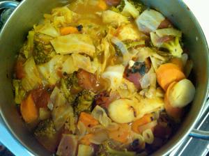 I chopped two cloves of garlic and a medium yellow onion and sauteed them in a big pot with some olive oil.I chopped up half a head of cabbage.I peeled and sliced two large carrots and a parsnip. I beheaded a large bunch of broccoli and threw all of these in the pot. I stirred it all about then poured in 4 cups of vegetable broth. Then I threw in a large can of fire roasted whole tomatoes – juice and all. I let this cook until a fork could easily penetrate the carrots and parsnips.
