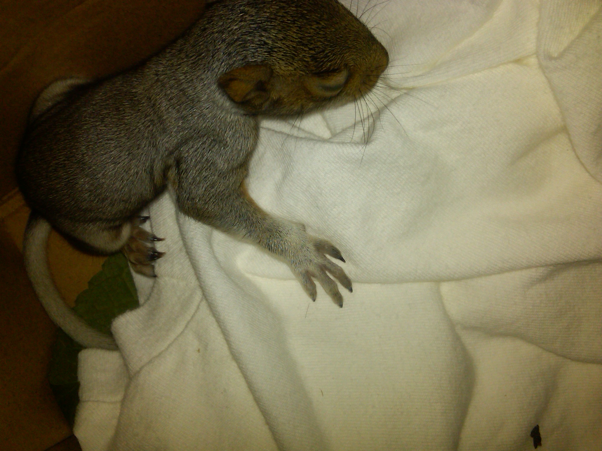 It was late so we all went to bed. The baby squirrel lay in her box with pieces of the elm and a soft towel.