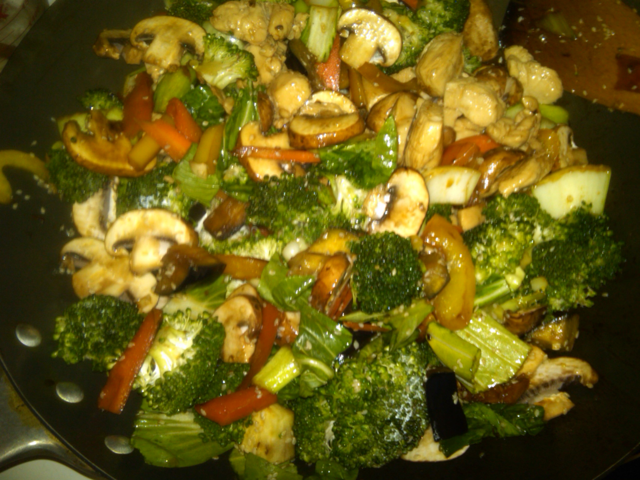 Keep stirring the vegetables, add more oil and /or soy sauce depending yon your taste