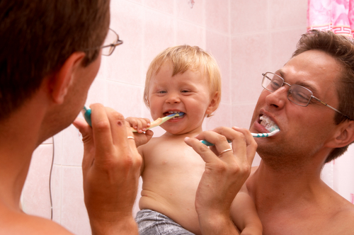 Let your baby see you brush your teeth. Let your baby brush your teeth! Make it fun. Brush each other’s teeth.