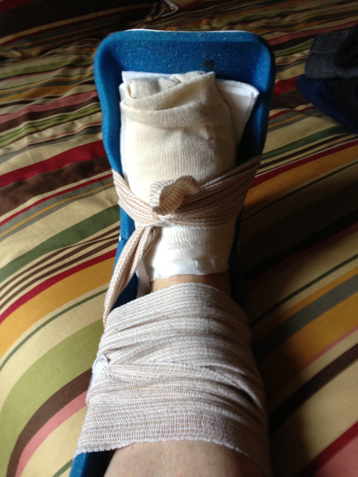 The humbling reality of my situation is beginning to kick in. The Percocet is being replaced by Acetaminophen and my fog is wearing off. Last Thursday my foot was sort of reconstructed. I went to the doctor yesterday for my post-op follow-up and saw the hardware store that is my foot. There are 4 screws and my foot is swollen and bruised. In the half second that I could bare to look I saw Frankenstein. Rob was disappointed that I did not photograph the gore.